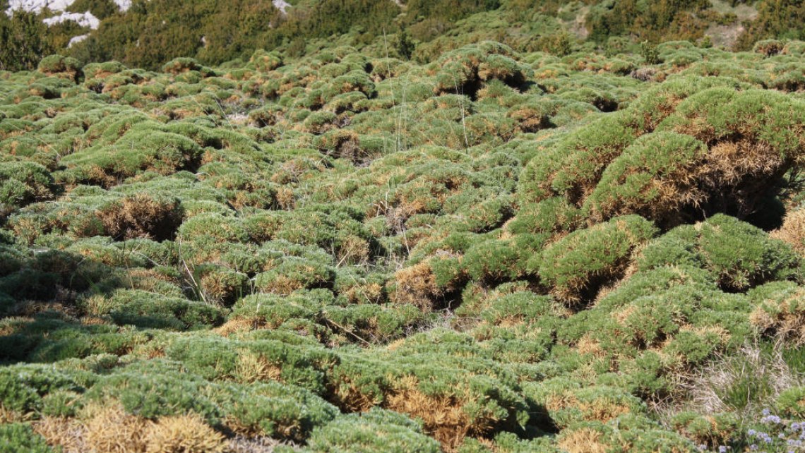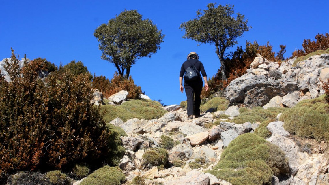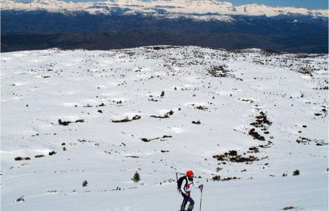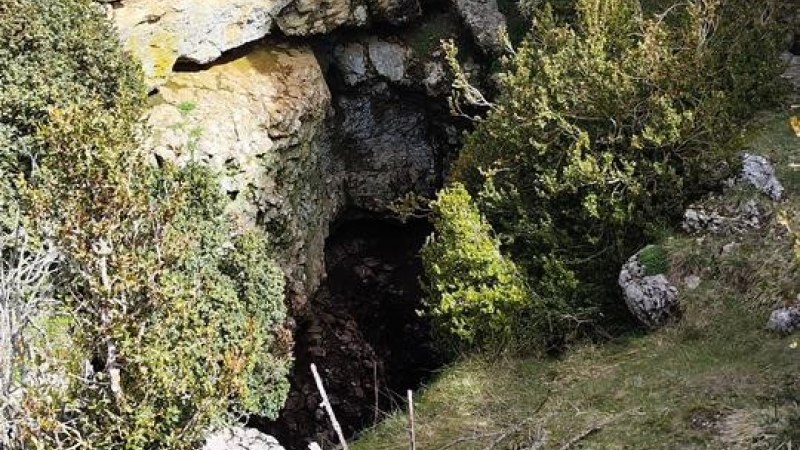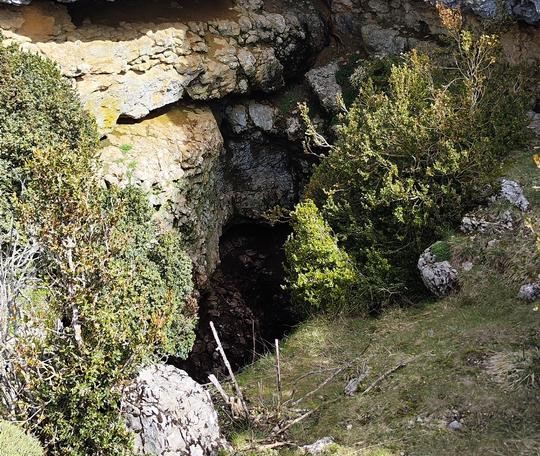 1695m Después de crestear unos 500m dirección Este, tomamos el sendero de la izquierda que nos acercará a la mítica Grallera de Guara. Se trata de una sima de más de 270m explorados, que alberga algunas historias que han despertado interés entre la población. Debemos ser prudentes y no acercarnos demasiado al borde por un posible deslizamiento. El nombre de grallera se debe a que es un espacio donde anidan las grallas (grajos)